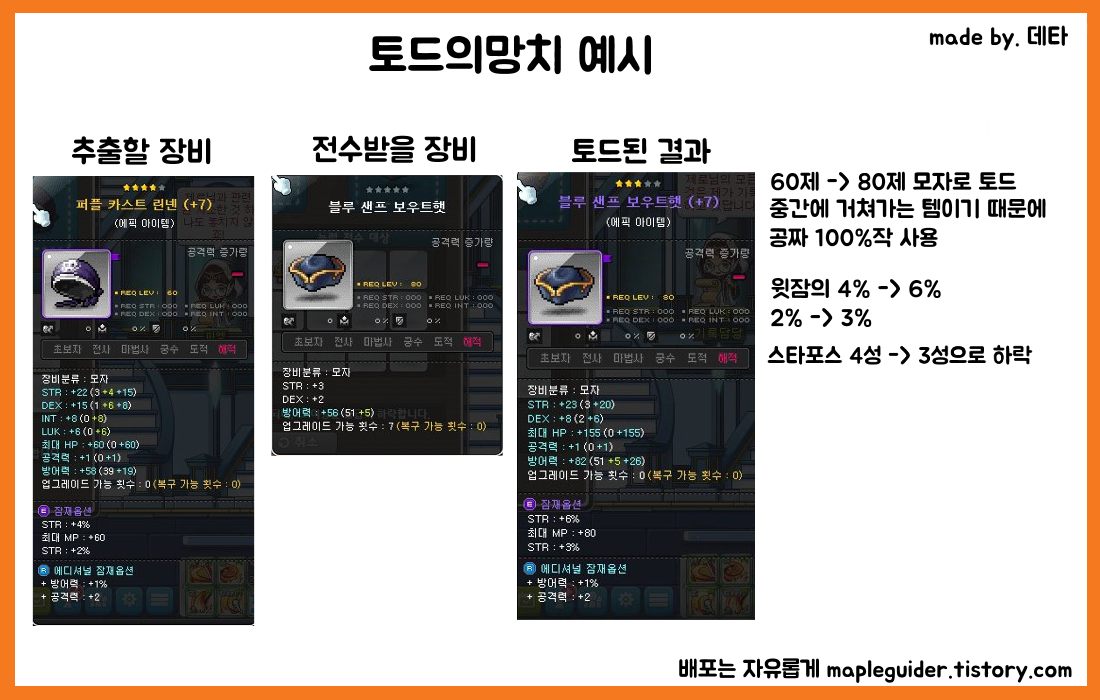 주의할점: 유니크 올스탯 6%는 토드하면 에픽 올스탯 3%됨. 주스텟은 유니크 9% -> 에픽 6% 아니면 유니크 6% (두세번째줄) -> 에픽 6% 그대로 토드됨